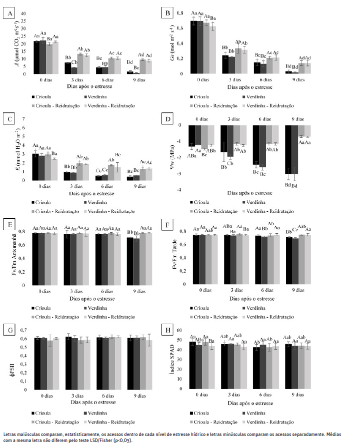 Figura 3 Fotossíntese (A) (A); Condutância estomática (Gs) (B) Transpiração (E) (C); Potencial hídrico foliar (D); Eficiência quântica potencial do PSII (Fv/Fm) na antemanhã (E) e de Tarde (F); Eficiência quântica efetiva do PSII (ɸPSII) ao meio dia (G) e índice SPAD (H) em acessos de anona submetidas ao estresse hídrico e reidratados na época chuvosa.