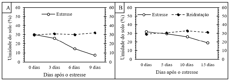 Figura 2 Umidade de solo com dois acessos de anona (A. squamosa) submetidas a estresse hídrico na época seca (A) e época chuvosa (B).