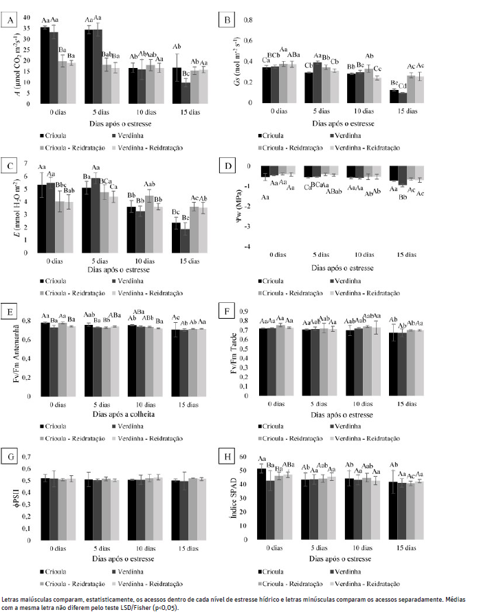 Em relação a taxa fotossintética as mudas obtiveram maior recuperação nas plantas submetidas ao estresse máximo, sendo 1,63 e 0,80 μmol CO2 m-2s-1 elevando-se para 9,50 e 8,82 μmol CO2 m-2s-1 para cv. Crioula e cv. Verdinha, respectivamente.
