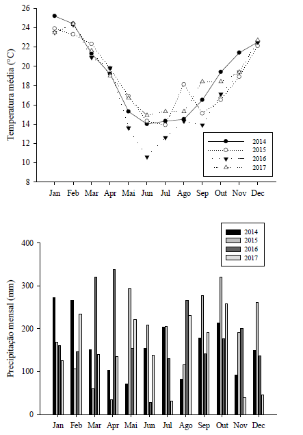 A temperatura média e precipitação mensal dos anos de 2014, 2015, 2016 e 2017 foram coletados da estação meteorológica da Embrapa Clima Temperado, localizado no município de Pelotas, RS, Brasil (Figura 1). A precipitação total foi de 1940,4 mm no ano de 2014, de 2244 mm no ano de 2015, 2203 mm no ano de 2016 e 1793,5 mm no ano de 2017.