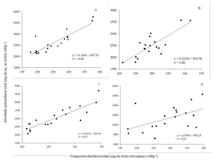 Figura 2 Correlação linear de Pearson entre atividade antioxidante total e compostos fenólicos totais dos frutos de pessegueiros cv. Esmeralda submetidos a diferentes doses de potássio no ano de 2014 (A), 2015 (B), 2016 (C) e 2017 (D).