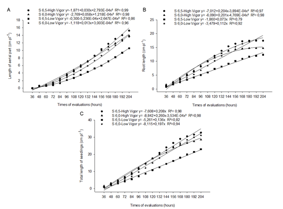 The differences between seedling lengths with different vigor levels and sieve sizes, evaluated every 12 hours, can be observed in Figure 1. For shoot length (Figure 1A) all treatments were adjusted to the quadratic model. From the 96 hour time, it is possible to visualize an expressive difference for the sieve curves (6.5 and 6.0 mm) between the high and low vigor levels. Seeds from high vigor lots, regardless of seed size tested, presented higher SL for all evaluation times.
