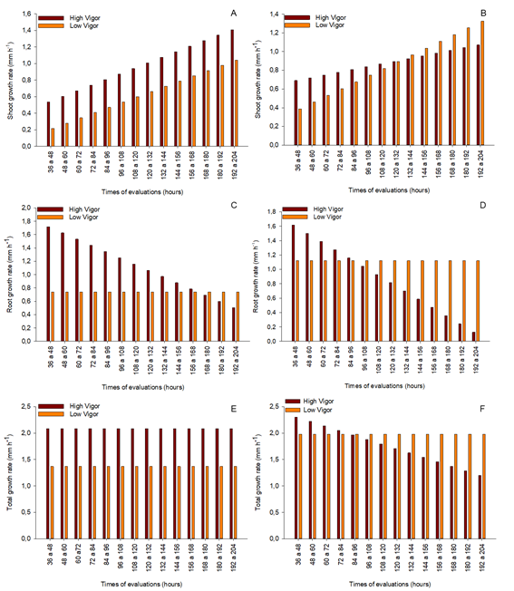 Figure 2 Growth rate of soybean seedlings in mm h-1, originated from seeds with different vigor levels. A - Growth rate of shoot, sieve 6.50 mm; B - Shoot growth rate, 6.00 mm sieve; C - Root growth rate, sieve 6.50 mm; D - Root growth rate, sieve 6.00; E - Total growth rate, sieve 6.50 mm; F - Total growth rate, 6.00 mm sieve.