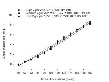 Up to 72 hours, the seedlings originated from high, medium and low vigor seeds were similar for SL. Between 120 and 168 hours the SL of the seedlings obtained from seeds of high and medium vigor were superior to the seedlings of low vigor. In the time of 84 hours after the installation of the experiment, the high vigor level was superior to the others. This occurred also in the time of 108 hours. After 180 hours, the level of medium vigor was higher than the high and low. For the interaction between times and evaluations x levels of vigor, seedling length values from high vigor seed (R² = 0.97) were adjusted to the linear model with high coefficient of variation. However, those from seeds of medium vigor (R² = 0.98) and low vigor (R² = 0.98) showed that the SL adjusted to the quadratic model (Figure 3).