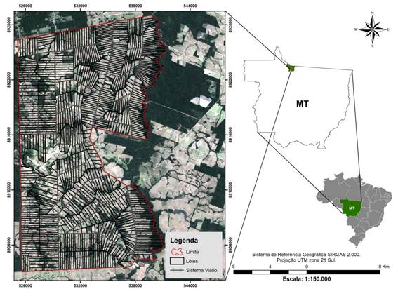 A área de estudo, denominada Projeto de Assentamento São Pedro, está localizada no município de Paranaíta-MT, região norte do estado de Mato Grosso, com coordenadas centrais: 9°42'37,710" S 56°45'31,464" W (Figura 1).