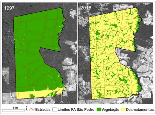 Figura 2 Representação da área desmatada no Assentamento São Pedro, Paranaíta, Mato Grosso, Brasil, nos anos de 1997 e 2018.