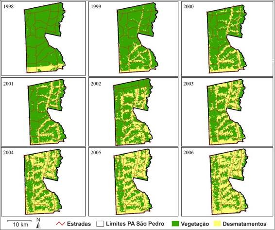 Nesse sentido, dos 22 mapas gerados, as imagens referentes ao primeiro e último anos do período objeto de estudo, bem como àquelas referentes aos anos de 1998 a 2006, inclusive, onde estão compreendidos os períodos de ocupação do assentamento e de aplicação de recursos do credito rural provenientes do Programa Nacional de Fortalecimento da Agricultura Familiar - Pronaf. Esses mapas foram selecionados por serem os que melhor elucidam o objetivo desta pesquisa, qual seja, o de relacionar o desmatamento aos efeitos das políticas públicas implantadas e/ou sua falta ou insuficiência.