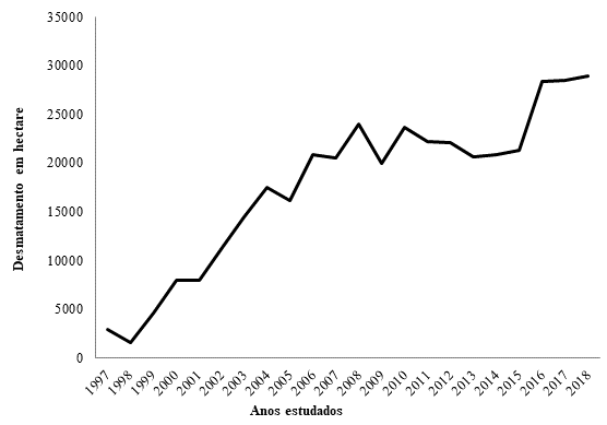 Figura 4 Total de área desmatada no Assentamento São Pedro, Paranaíta, Mato Grosso, Brasil, de 1997 a 2018.