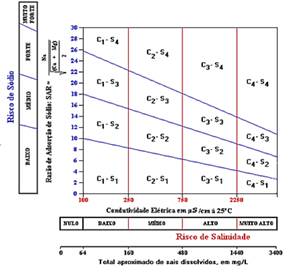 A concentração dos íons como sódio, potássio, cálcio, magnésio, cloretos, sulfatos, carbonatos e bicarbonatos, bem como do pH, Condutividade Elétrica (CE) e Razão de Adsorção de Sódios (RAS), são os principais parâmetros físico-químicos utilizados na classificação da água para fins agrícolas, pois são capazes de influenciar no crescimento de cada espécie vegetal (Lima et al., 2014). A relação entre a CE e RAS, definem o risco da água em causar salinidade e sodicidade ao solo (Figura 1).