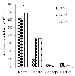 Figura 2 a) Área cultivada de amendoeira e b) número de árvores vendidas nas principais NUT II produtoras de amêndoa no período 2015-2017 (INE, 2015, 2016, 2017).