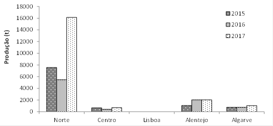 A produção de amêndoa por NUT II reflete as áreas plantadas, sendo, como já indicado anteriormente, no Norte que se encontram os valores mais elevados (Figura 3). É também de destacar o aumento de produção de 2017 em comparação com o ano anterior. Ainda que a amendoeira seja uma espécie de marcada alternância, sobretudo quando cultivada em sequeiro, é provável que o aumento de produção registado em 2017 seja também o reflexo de novos pomares em crescimento, a grande maioria em regadio, a aumentarem a sua produtividade. Os baixos valores de 2016 podem estar associados a chuvas persistentes que se registaram na floração e a alguns problemas fitossanitários associados. Ainda que em escala menor, o incremento de produção em 2017 verificou-se também nas restantes regiões produtoras.