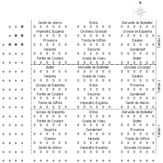 O campo de ensaio foi dividido em 3 talhões (Figura 1), seguindo o alinhamento das 3 repetições de cultivares instaladas, identificadas de 1 a 3, com cerca de 90 árvores cada, tendo-se excluído as árvores de bordadura de cada talhão.