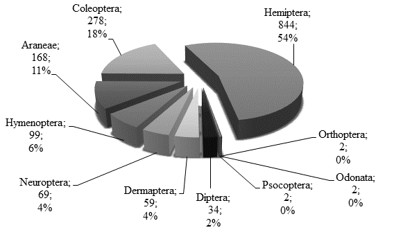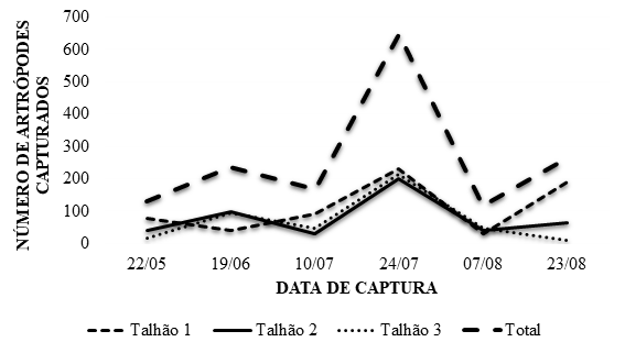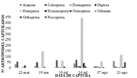 Capturaram-se 1557 artrópodes pertencentes a 9 ordens da classe Insecta e à ordem Araneae da classe Arachnida, sendo a classe Insecta a mais representativa com cerca de 88% dos artrópodes capturados.