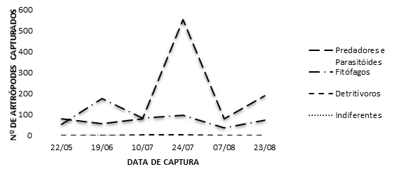 As morfoespécies foram agrupadas em grupos funcionais baseados na informação taxonómica e hábitos alimentares: predadores (organismos que se alimentam de presas), parasitóides [organismos que em estados imaturos se desenvolvem à custa de um organismo de outra espécie (hospedeiro) conduzindo à sua morte], fitófagos (organismos que se alimentam de plantas), detritívoros (organismos que se alimentam de detritos, matéria vegetal morta) e “indiferentes” (organismos sem ação de interesse) (Carlos e Torres, 2009; Coutinho, 2007).