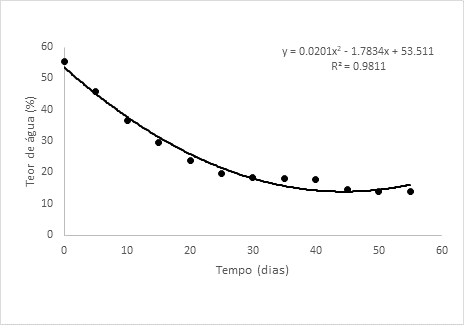 O teor de umidade das sementes de Cojoba arborea recém-colhidas foi de 55,4%, diminuindo de maneira lenta em relação ao tempo de secagem (Figura 1), característico das sementes recalcitrantes.