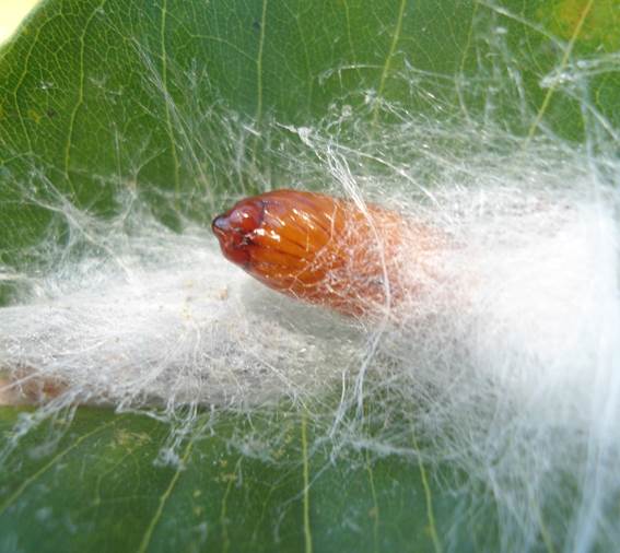 Com auxílio de podão com cabo telescópico, folhas contendo lagartas e pupas foram retiradas das árvores, acondicionadas em caixa de isopor e transportadas ao Laboratório de Entomologia da Embrapa Acre. Em laboratório, seis lagartas e duas pupas foram acondicionadas em caixa de criação telada, até a emergência dos adultos, sendo a gaiola inspecionada diariamente.
