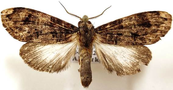 Após cerca de 20 dias, houve emergências de três mariposas (2♂ e 1♀) as quais foram identificadas como Lusura chera (Drury, 1773) (Lepidoptera: Notodontidae) (Figura 2), com base em comparações com as descrições originais da espécie e seus sinônimos, segundo o checklist de Becker (2014). Atualmente, Lusura altrix (Stoll, 1780) é considerada sinônimo júnior de L. chera (Becker, 2014), portanto, todos os registros anteriores de L. altrix em B. excelsa (Ronchi-Teles 1991; Thomazini & Reis, 2008; Haugassen, 2009) referem-se a L. chera. Os espécimes foram depositados na Coleção Entomológica da Embrapa Acre.