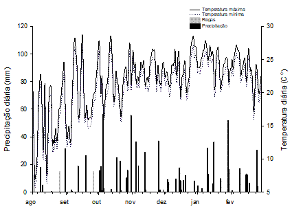 Na Figura 1, apresentam-se os dados médios diários de temperaturas máxima e mínima e precipitação, oriundos de estação meteorológica Instituto Nacional de Meteorologia (INMET), no campus da UFSM em Frederico Westphalen / RS, além das regas realizadas. Devido aos baixos volumes de precipitação, 68 e 48 mm, ocorridos durante os meses de Agosto e Setembro, respectivamente, realizou-se duas regas por aspersão, com aplicação de 15 mm de lâmina de água cada, a fim de garantir que não houvesse interferência nos resultados por déficit hídrico.
