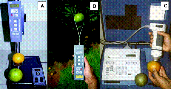 Com o auxílio de um tensiômetro (Digital Force Gage, modelo FDV-10, 10 lb x 0,0005 lb), mediu-se a força necessária (Newton) para destacar os frutos por planta, através de tensionamento (Figura 1). Foi avaliado cinco frutos por planta.