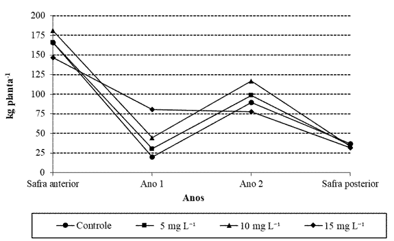 As oscilações marcantes na produção de frutos (kg planta-1) de um ano para outro apresentadas no Quadro 4 e demonstrada graficamente esta variação entre os anos através da Figura 2, confirmam o efeito de bianualidade observada na citricultura e descrito por Tubelis et al. (1999). Estes dados evidenciam que a queda ou aumento na produtividade pode não ser efeito dos tratamentos, mas da característica intrínseca dos citros e de condições edafoclimáticas.