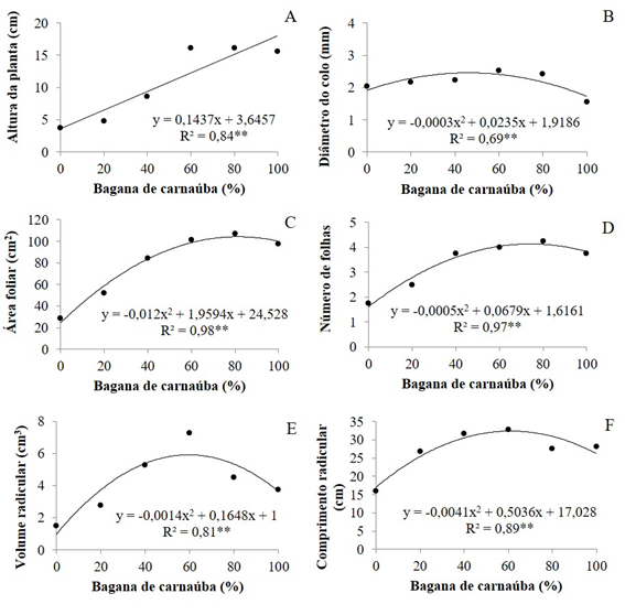 Constatou-se aumento linear de 2,87 cm na altura da planta em resposta a cada aumento da proporção de BC no substrato (Figura 1A). Porém, para o diâmetro do colo, houve apenas aumento até 39,2% BC (2,4 mm); até 81,6% BC (104,5 cm2) para a área foliar; e até 67,9% BC (3,9 folhas) para o número de folhas, seguidos de redução com os incrementos de BC (Figura 1B, C e D).