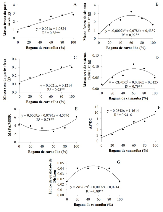 A relação massa seca da parte aérea/massa seca do sistema radicular e índice de qualidade de Dickson apresentaram resposta quadrática (Figura 2E e G), enquanto que a relação altura da planta/diâmetro do colo apresentou uma resposta linear, em relação às crescentes proporções de BC nos substratos (Figura 2F).