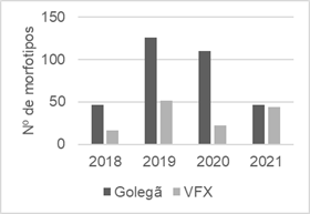 No que se refere à diversidade, na cultura principal, o número total de morfotipos separados foram 62, 157, 132 e 117 em 2018, 2019, 2020 e 2021 respetivamente.