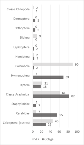 As capturas, em número total de indivíduos, variaram de ano para ano e entre campos. Foram encontrados organismos pertencentes aos quatro sub-filos de artrópodes, Chelicerata, Hexapoda, Crustacea e Myriapoda, sendo que é na classe Insecta que se encontra a maior parte dos organismos capturados (cerca de 80%) (Valério et al., 2021).
