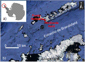 Figura 1 Situación de la región de estudio en la Antártida (a) y localización de la Péninsula Hurd y Punta Hannah en la isla Livingston (b).