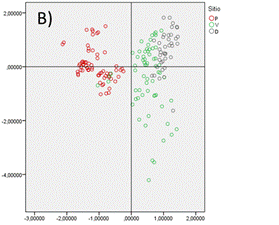 Figura 2 Componentes principales. A) Diagrama de saturación que representa los elementos del suelo. B) Dispersión de puntos que representa los distintos tipos de suelos: P (pingüinera), V (vegetación) y D (suelos desnudos).
