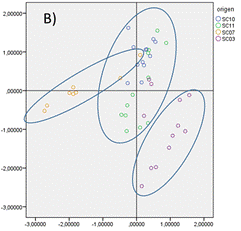 Los grupos representados en la Figura 3 son de cuatro muestreos o “parches” vegetales, tomados siguiendo un gradiente longitudinal en la Peninsula Hurd, desde la costa hasta una zona cercana al glaciar. El análisis de componentes principales muestra nuevamente trés grupos (Figura 3-B) que son separados por la componente 1 que explica el 55% de la variabilidad total. En la dirección de izquierda (-) a derecha (+) de esta componente encontramos el “parche” de musgos más abundante (SC07), situado más cerca de la costa, donde la humedad es mayor, seguido de los “parches” de vegetación intermedios (SC10, SC11), que representan zonas menos abundantes en número de especies y que se encuentran más cerca de elementos como fósforo, estroncio y calcio; y el último el “parche” (SC03), con una mayor proporción de líquenes que de musgos y situado en la zona más cercana al glaciar, presenta una mayor proporción de Si, Zn y Al, que posiblemente se trate de silicatos. Esta diferencia entre ellos puede ser debida a la distinta abundancia y mayor diversidad de especies entre las coberturas vegetales, que modifica la composición mineral del suelo.