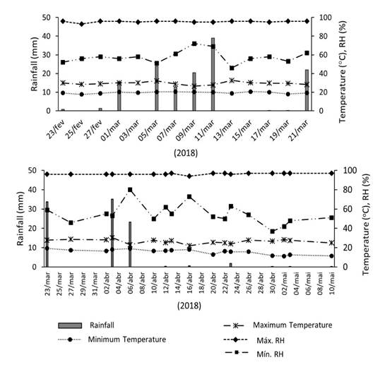Figure 1 Meteorological data from the municipality of Viçosa-MG during the pre-harvest period (02/23/2018 to 03/21/2018) (A) and harvest period (03/23/2018 to 05/10/2018) (B). Total daily rainfall (mm), daily maximum and minimum temperature (oC), and daily maximum and minimum relative humidity (RH %). Source: Meteorological Station 86824 located in Viçosa-MG. INMET (2018)