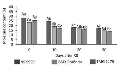 Figure 2 Moisture content of soybean seeds harvested at R8 and 10, 20, and 30 days after R8. Uppercase letters compare cultivars at each harvest time and lowercase letters compare harvest periods for each cultivar by Tukey test at 5% probability.