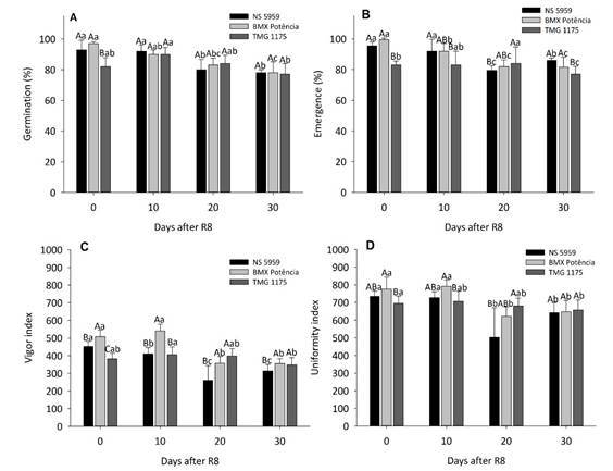 Figure 3 Germination (A), emergence (B), vigor index (C), and uniformity index (D) of soybean harvested at R8 and 10, 20, and 30 days after R8. Uppercase letters compare cultivars at each harvest time and lowercase letters compare harvest periods for each cultivar by Tukey test at 5% probability.