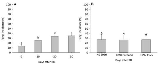Figure 4 Incidence of fungi in soybean seeds harvested at R8 and 10, 20, and 30 days after R8. Uppercase letters compare the different cultivars and lowercase letters compare harvesting periods by Tukey test at 5% probability.
