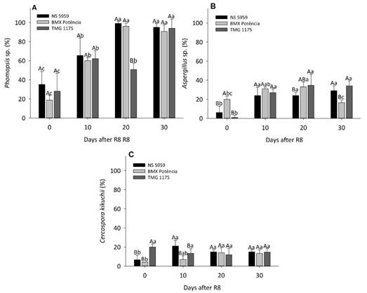 Figure 5 Incidence of the fungus Phomopsis sp. (A) Aspergillus sp. (B) and Cercospora kikuchii (C), in soybean seeds harvested at R8 and 10, 20, and 30 days after R8. Uppercase letters compare cultivars at each harvest time and lowercase letters compare harvesting periods for each cultivar by Tukey test at 5% probability