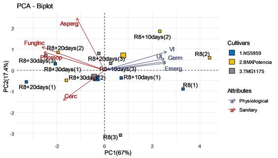 The treatments for harvests at R8 + 20 and R8 + 30 days, for all cultivars, were positioned in the negative scores of PC1 and opposite directions to the vectors of the physiological quality variables, showing less correlation and lower values for them. Furthermore, these treatments were concentrated near the vectors related to seed health (FungInc, Phomop, Asp, and Cerc). Thus, PCA allowed reinforcing that the treatments R8 + 20 and R8 + 30 days correlate with the lower physiological quality of seeds due to the greater fungal action in the deterioration that occurred in the field due to the delay in harvest and greater exposure to adverse effects in the field.