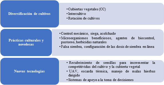 La agroecología es un enfoque global que se basa y maximiza el uso de las funcionalidades del ecosistema natural para apoyar la producción agrícola. Aplicado al control de las malas hierbas, consistirá en medios preventivos o curativos para romper los ciclos de desarrollo de las malas hierbas y evitar así que sean perjudiciales para el cultivo principal. Estos medios se basarán en mecanismos naturales de regulación entre las especies vegetales, entre ellas o con el microbioma del suelo, o incluso induciendo un cambio temporal en la aparición de las malas hierbas. Otros métodos alternativos (mecánicos, físicos, digitales) también pueden combinarse con estas alternativas naturales, que, por sí solas, probablemente sólo sean parcialmente eficaces. La gestión agroecológica de las malas hierbas (AWM, Agroecological Weed Management) se considera un tema de actualidad en Malherbología, que amplía el alcance de la gestión integrada, sostenible y ecológica de las malas hierbas al implicar y capacitar a las personas para tomar decisiones más racionales sobre la protección de los cultivos, el diseño de sistemas agrícolas y la conservación de los agroecosistemas. Aunque los enfoques de la AWM podrían definirse de muchas maneras, podría afirmarse que existen principalmente tres pilares (diversificación de cultivos, prácticas culturales y novedosas, nuevas tecnologías) que responden a las necesidades de simplificación, mejora y digitalización de la agricultura (Figura 1).