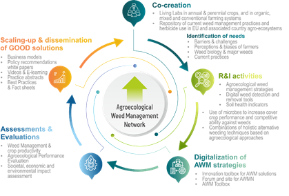 3) Sensibilización: Se llevará a cabo a través de una serie de herramientas de acceso libre para las diversas partes interesadas, incluyendo un repositorio sobre manejo agroecológico que fomente la adopción de este tipo de soluciones, una “caja de herramientas digitales” de libre acceso para ayudar a la toma de decisiones para la gestión de arvenses, un módulo de formación sobre soluciones AWM que proporcione guías "fáciles de adoptar" y "a medida" e informes de buenas prácticas para ofrecer evidencia cuantitativa y cualitativa de la solución óptima en los países pertenecientes a la UE.