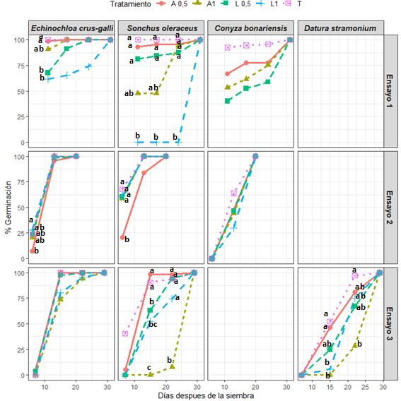 Figura 1 Porcentaje de emergencias a lo largo del tiempo en los tres ensayos. Diferentes letras indican diferencias significativas según el test no paramétrico de Kruskal-Wallis con P<0.05 en cada fecha ensayo y especie. En ensayo 1, Conyza bonariensis y L1 no hubo germinaciones, siendo el control total.