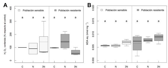 Figura 1 Contenido de H2O2 (A) y equivalentes de malondialdehído o MDA (B), en poblaciones de Amaranthus palmeri sensible y resistente a inhibidores de ALS. Tratamientos: sin tratar (control, C), dosis recomendada de nicosulfurón (N), y 3 veces la dosis recomendada de nicosulfurón (3N). No se observaron diferencias significativas entre tratamientos de cada población (ANOVA, HSD Tukey, p < 0,05).