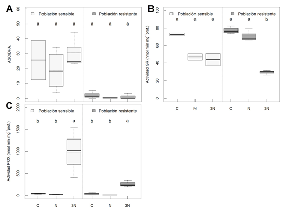Figura 2 Actividad glutatión reductasa o GR (A); actividad de las peroxidasas o POX (B); y cociente entre contenido de ascorbato o ASC y dehidroascorbato o DHA (C), en poblaciones de Amaranthus palmeri sensible y resistente a inhibidores de ALS. Tratamientos: sin tratar (control, C), dosis recomendada de nicosulfurón (N), y 3 veces la dosis recomendada de nicosulfurón (3N). Letras diferentes indican diferencias significativas entre tratamientos en cada población (ANOVA, HSD Tukey, p < 0,05).