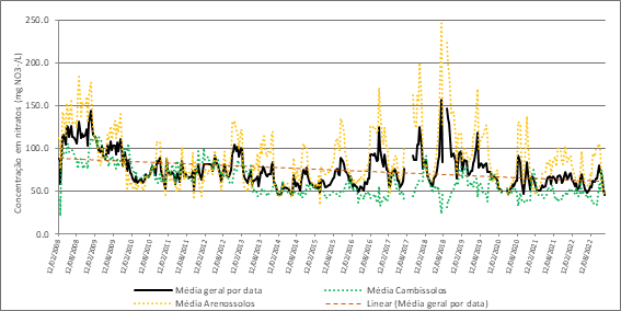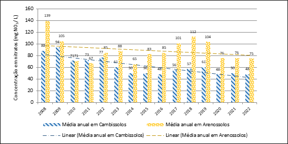 No intervalo de tempo analisado (2008-2022) os resultados globais indicam uma tendência de decréscimo da concentração média anual em nitratos, contudo existe uma acentuada oscilação ao longo dos anos. A tendência verificada é coerente com o que acontece a nível nacional nos três quadriénios (2008-2011, 2012-2015, 2016-2019), onde a avaliação global da qualidade das águas subterrâneas com base nas estações de monitorização da Agência Portuguesa do Ambiente, aponta para uma estabilização e até tendência de decréscimo da concentração (média e máxima) do ião nitrato (DGADR, 2012, 2016, 2020).
