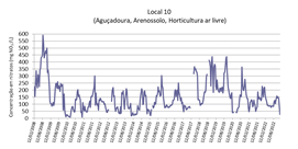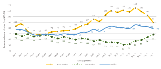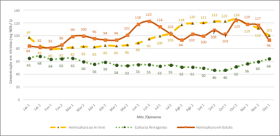 As concentrações médias anuais de nitratos nos pontos de água subterrânea analisados (2008-2022) foram de 101 mg NO3 -/l na horticultura em estufa, 99 mg NO3 -/l na horticultura ao ar livre e 57,5 mg NO3 -/l nas culturas forrageiras, ou seja, na água subterrânea não existe grande diferença na concentração média na horticultura, mas as suas concentrações são superiores às das culturas forrageiras. A evolução quinzenal da concentração de nitratos nas culturas forrageiras é semelhante à dos cambissolos, onde aliás são cultivadas, e a horticultura ao ar livre é semelhante aos arenossolos (Figura 6). A horticultura em estufa é ligeiramente diferente, verificando-se uma redução dos valores médios entre abril e outubro.
