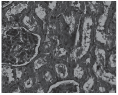 Perazella, (8) showed experimental data suggesting that both vascular, glomerular and tubular targets are involved in drug-induced nephrotoxicity, as a result of mechanisms that disrupt normal cellular structures and functions (mitochondria, membraneintegrity, etc.),induce renal injury through intratubular obstruction (crystal deposition), and promote cellular swelling and tubular luminal occlusion (through osmotic effects). These effects were observed in our work, as seen in group 2 treated with amikacin, where we observed discrete basal membrane interruptions.