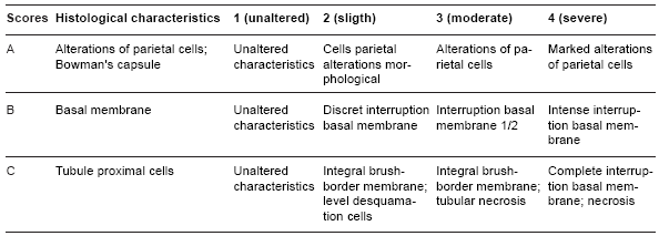 Table 1 - Scores of renal histological alterations in Wistar rats.