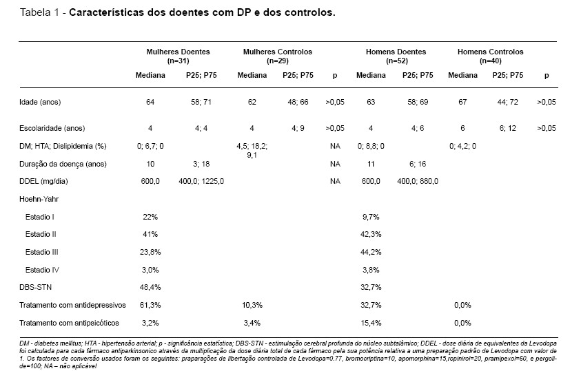 A mediana das idades para as mulheres foi de 64 anos e para os homens foi de 63 anos. A maioria das mulheres e homens estavam casados, eram católicos e estavam reformados. A mediana da escolaridade em ambos os sexos foi de 4 anos. Das mulheres, 41% estavam no estadio II de HY. Dos homens, 44,2% estavam no estadio III de HY. A duração da doença teve uma mediana de 10 anos para as mulheres e 11 anos para os homens . Os doentes de ambos os sexos estavam medicados com uma DDEL com a mediana de 600; realizaram cirurgia de estimulação cerebral profunda do núcleo subtalâmico (DBS-STN), 48,7% das mulheres e 32,7% dos homens (Tabela 1).