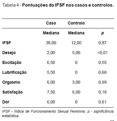 Os casos e os controlos têm pontuações reduzidas no IFSF. Verifica-se uma diferença estatisticamente significativa no domínio desejo entre casos e controlos com prejuízo das doentes (p<0,01) (Tabela 4