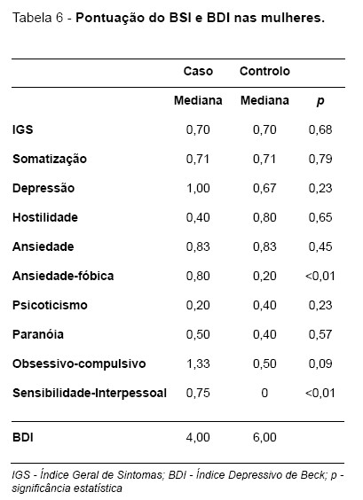 A pontuação obtida no BSI difere significativamente entre as doentes e os controlos do sexo feminino nos domínios de ansiedade fóbica (p<0,01) e de sensibilidade interpessoal (p<0,01) sendo superior nas doentes (Tabela 6
