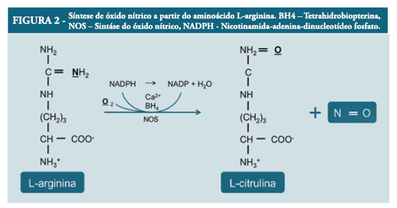 As três isoformas da NOS possuem mecanismos enzimáticos similares que envolvem a transferência de eletrões para oxidação do nitrogénio guanidina terminal da L-arginina. Todas essas enzimas requerem vários cofatores para exercer suas funções, incluindo a tetrahidrobiopterina (BH4), a nicotinamida-adenina-dinucleotídeo fosfato (NADPH), a flavina adenina dinucleotídeo (FAD) e a flavina mononucleotídeo19.Quando a NOS é inibida em modelos experimentais, usando antagonistas da L-arginina, há uma redução drástica na formação de NO, levando ao quadro hipertensivo, aumento da adesão e agregação plaquetária e maior oxidação de moléculas de LDL-colesterol, mostrando que o NO possui papel fundamental nos sistemas cardiovascular e endócrino-metabólico5. A Figura 2 ilustra a síntese do NO apartir da L-arginina.